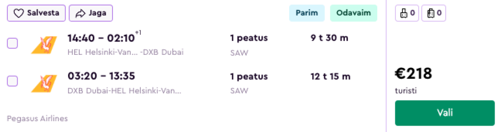 Pegasus pakub hetkel väga hea hinnaga lennupileteid Araabia Ühendemiraatidesse. Edasi-tagasi lennupiletid Helsingist Dubaisse on saadaval alates 218€ eest.