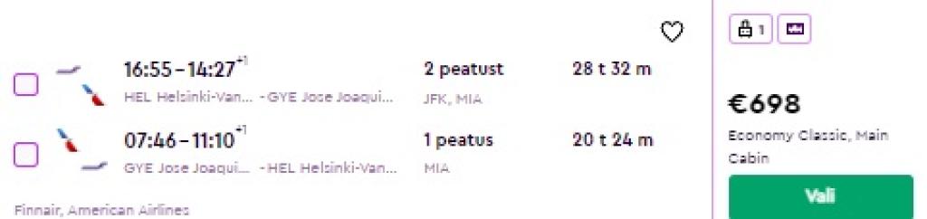 Oneworldi lennufirmad pakuvad hetkel suurepärase hinnaga lennupileteid Ecuadori! Edasi-tagasi lennupiletid Helsingist Guayaquili on saadaval 698€ eest ning saadavust leiab vahemikus septembrist märtsini. Lendudel on ümberistumised USA-s ning lennupiletite hinna sees on ka äraantav pagas. Toome allpool välja vaid mõned näidiskuupäevad, saadavust leiab ka teisteks kuupäevadeks. Parima hinnaga lennupiletid leiad üles läbi Momondo.ee