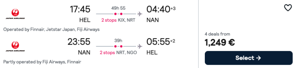 Japan Airlines koostöös Fiji Airwaysiga pakuvad hetkel väga hea hinnaga lennupileteid eksootilisele Fidžile! Edasi-tagasi lennupiletid Helsingist Nadisse on saadaval alates 1249€ eest ning soodsa hinnaga lennupileteid leiab nii talveks kui suveks.