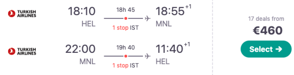 Turkish Airlines pakub hetkel väga hea hinnaga lennupileteid Helsingist Filipiinidele. Edasi-tagasi lennupiletid Helsingist pealinna Manilasse on saadaval alates 460€ eest ning lendudel on mõlemal suunal üks kiire ümberistumine Istanbulis. Lennupiletite hinna sees on nii äraantav pagas kui toitlustamine Turkish Airlinesi pardal. Saadavust leiab alates detsembri algusest kuni veebruarini. Lennud Helsingist väljuvad õhtul ning saabuvad ennelõunal, seega jõuab Tallinnast lennule ilusti mõnda laevaoperaatorit kasutades.