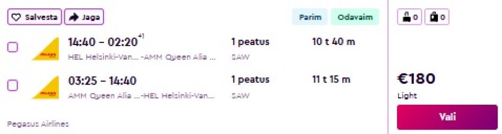 Pegasus pakub hetkel väga hea hinnaga lennupileteid Jordaaniasse. Soodsaimad edasi-tagasi lennupiletid Helsingist Jordaania pealinna Ammanisse on saadaval 180€ eest ning saadavus on märtsis-aprillis. Lendudel on mõlemal suunal üks ümberistumine Istanbulis.