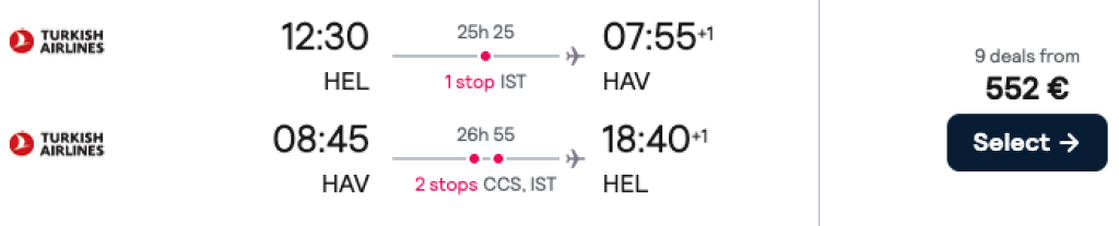 Turkish Airlines pakub hetkel hea hinnaga lennupileteid Kuubale. Edasi-tagasi lennupiletid Helsingist pealinna Havannasse on saadaval alates 552€ eest.