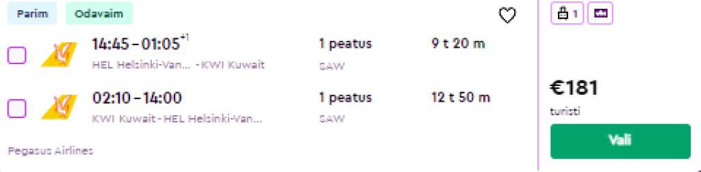 Pegasus pakub hetkel väga hea hinnaga lennupileteid Kuveiti! Edasi-tagasi lennupiletid Helsingist on saadaval alates 181€ eest ning ohtralt soodsa hinnaga lennupileteid leiab augustist märtsini. Lennud on mõlemal suunal ühe ümberistumisega Istanbulis. Lennupiletititeni jõudmiseks kliki allolevatel näidiskuupäevadel või kontrolli endale sobivaid kuupäevi läbi Momondo.ee.