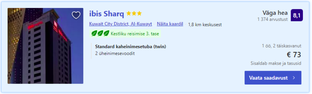 Näiteks võid leida toa väga heade reitingutega hotellis Ibis Sharq üheks ööks kahele vaid 73€ eest. Lisainfo ja broneerimine.