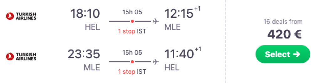 Turkish Airlines pakub hetkel suurepärase hinnaga lennupileteid Helsingist Maldiividele. Edasi-tagasi lennupiletid on saadaval alates 420€ eest ning saadavust leidub septembris-oktoobris ning alates jaanuarist kuni märtsi keskpaigani. Lennupiletite hinna sees on nii äraantav pagas kui toitlustamine Turkish Airlinesi pardal. Turkish Airlinesi lennuajad Helsingist on väga head Tallinna ja Helsingi vahel laevaga reisimiseks. Piletiteni jõudmiseks kliki allolevatel näidiskuupäevadel või kontrolli endale sobivaid kuupäevi läbi Skyscanneri