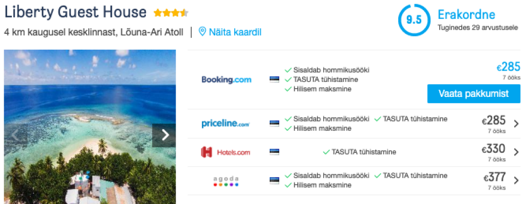 Hotellipakkumised MaldiividelKui otsid soodsa hinnaga öömaja, siis soovitame parima ülevaate ja hinna saamiseks kasutada hotellihindade võrdlusportaali Hotelscombined.ee