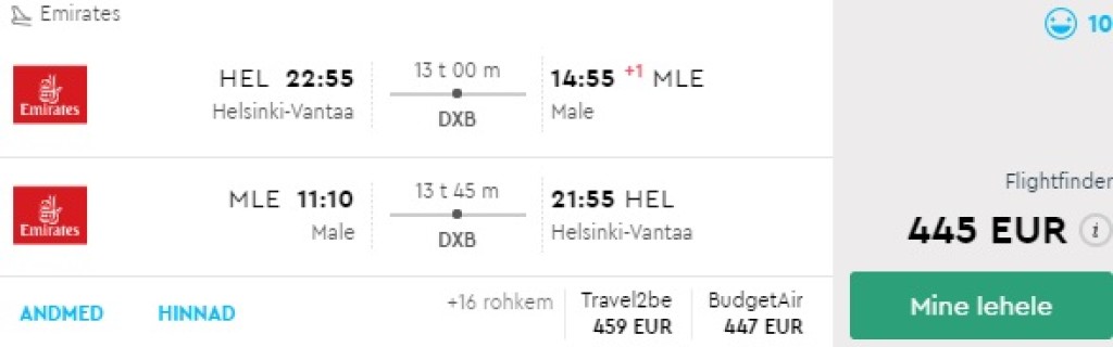 Emirates koostöös flydubaiga pakuvad hetkel väga hea hinnaga lennupileteid sügiseks Helsingist Maldiividele. Edasi-tagasi lennupiletid on saadaval alates 445€ eest ning saadavust leidub oktoobrist detsembrini. Piletiteni jõudmiseks kliki allolevatel näidiskuupäevadel või kontrolli endale sobivaid kuupäevi läbi Momondo.ee