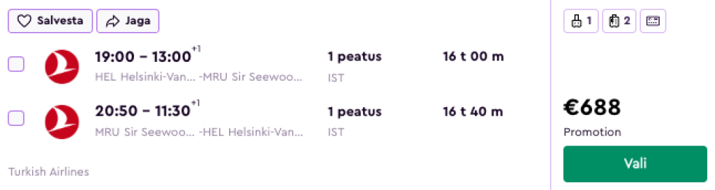 Turkish Airlines pakub hetkel suurepärase hinnaga lennupileteid India ookeanis asuvale Mauritiuse saarele. Edasi-tagasi lennupiletid Helsingist on saadaval alates 688€ eest.