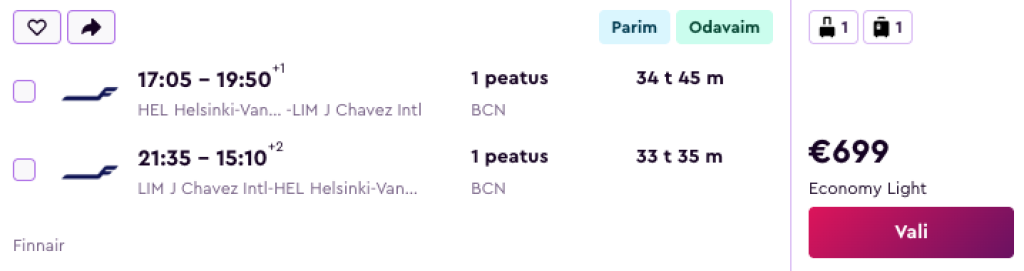 Finnair koostöös Iberia ja Leveliga pakuvad hetkel väga hea hinnaga lennupileteid Peruusse. Edasi-tagasi lennupiletid Helsingist Peruu pealinna Limasse on saadaval alates 699€ eest ning lennupiletite hinnas sisaldub ka äraantav pagas. Kõikidel meie poolt välja otsitud näidiskuupäevadel on üks ümberistumine kas siis Barcelonas või Madridis. Miinuseks on tulenevalt lennuplaanidest tihtipeale pikem ümberstumine emb-kumb linnas, mis annab ka võimaluse nende põnevate linnadega tutvumiseks.