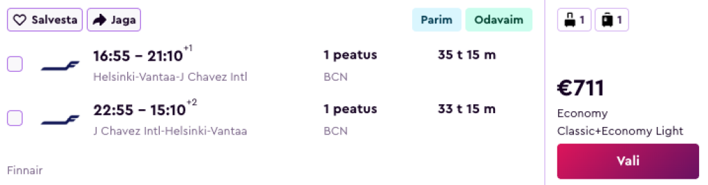 Finnair koostöös Iberia ja Leveliga pakuvad hetkel väga hea hinnaga lennupileteid Peruusse. Edasi-tagasi lennupiletid Helsingist Peruu pealinna Limasse on saadaval alates 711€ eest ning lennupiletite hinnas sisaldub ka äraantav pagas. Kõikidel meie poolt välja otsitud näidiskuupäevadel on üks ümberistumine kas siis Barcelonas või Madridis. Miinuseks on tulenevalt lennuplaanidest tihtipeale pikem ümberstumine emb-kumb linnas, mis annab ka võimaluse nende põnevate linnadega tutvumiseks.