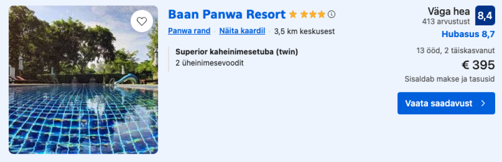 Toome allpool välja pakkumise, kuidas broneerides iseseisvalt eraldi nii Juneyao lennupiletid Helsingist kui majutuse väga heade reitingutega 4* hotellis , saab kahenädalase (13 ööd kohapeal) puhkusereisi Phuketi saarele kätte alates 758€ eest/inimene.
