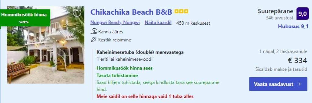 Kui otsid soodsa hinnaga öömaja Sansibaril, siis soovitame parima ülevaate ja hinna saamiseks kasutada majutushindade võrdlusportaali Booking.com