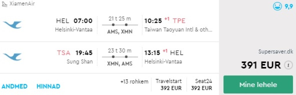 Xiamen pakub hetkel soodsa hinnaga lennupileteid Helsingist Taiwani. Edasi-tagasi lennupiletid leiab üles alates 391€ eest. Lendudel on kaks ümberistumist mõlemal suunal. Saadaval on lennukuupäevi oktoobrist kuni detsembrini.Parima hinnaga lennupiletid leiad üles läbi Momondo.ee