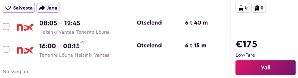 Norwegian pakub hetkel väga hea hinnaga lennupileteid Kanaaridele. Edasi-tagasi lennupiletid otselendudele Helsingist Tenerifele on saadaval alates 175€ eest.