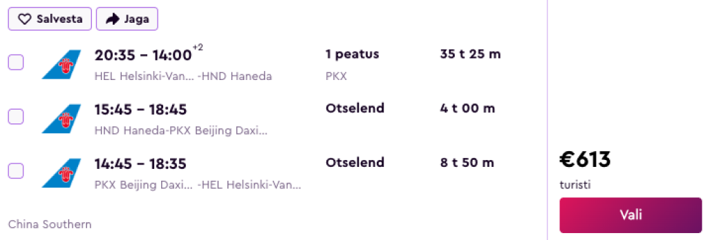 Märtsi lõpus Helsingist Pekingisse lende alustav China Southern pakub hetkel väga hea hinnaga lennupileteid Jaapanisse. Soodsaimad edasi-tagasi lennupiletid Helsingist Tokyosse on saadaval alates 589€ eest ning hinnas sisaldub ka 2x23kg äraantavat pagasit.
