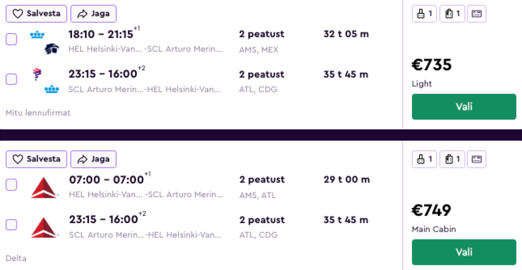 Delta pakub hetkel väga hea hinnaga lennupileteid Tšiilisse. Edasi-tagasi lennupiletid Helsingist pealinna Santiagosse on saadaval alates 735€ eest ning lendudel on mõlemal suunal 2 ümberistumist.