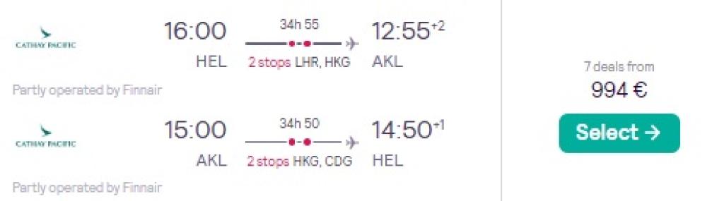 Kvaliteetne Cathay Pacific pakub hetkel suurepärase hinnaga lennupileteid Okeaaniasse! Edasi-tagasi lennupiletid Helsingist Uus-Meremaale on saadaval alates 994€ eest ning saadaval on soodsaid lennukuupäevi sügiseks. Lendudel on mõlemal suunal kaks ümberistumist. Lennupiletite hinna sees on ka äraantav pagas ning toitlustamine Cathay Pacificu lennukite pardal. Parima hinnaga lennupiletid leiad üles läbi Skyscanneri.