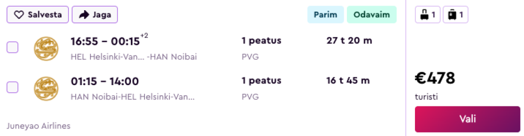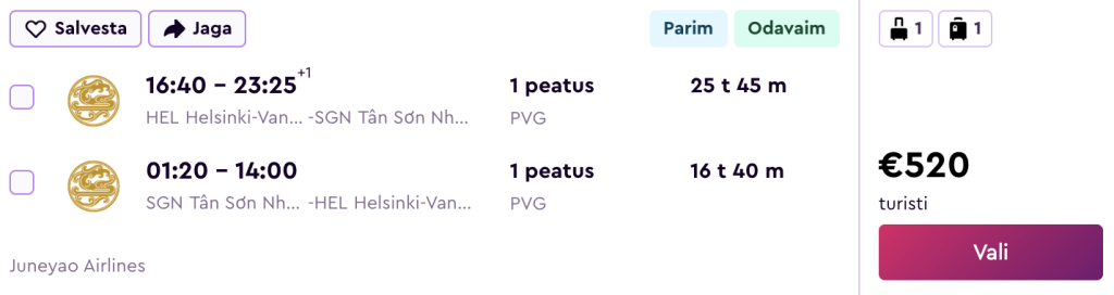 Juneyao Air pakub hetkel väga hea hinnaga lennupileteid Vietnamisse. Edasi-tagasi lennupiletid Helsingist Ho Chi Minh Citysse on saadaval alates 520€ eest ja Hanoisse alates 478€ eest.