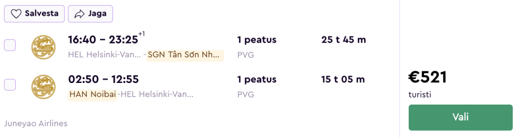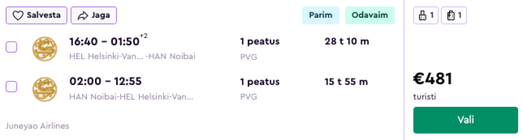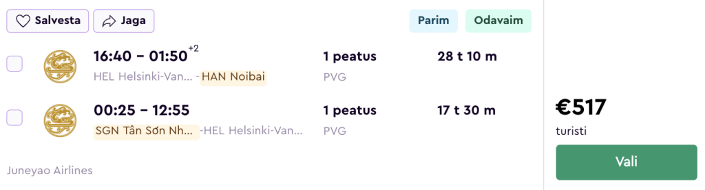 Juneyao Air pakub hetkel väga hea hinnaga lennupileteid Vietnamisse. Edasi-tagasi lennupiletid Helsingist Ho Chi Minh Citysse on saadaval alates 517€ eest ja Hanoisse alates 481€ eest.