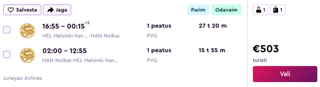 Juneyao Air pakub hetkel väga hea hinnaga lennupileteid Vietnamisse. Edasi-tagasi lennupiletid Helsingist Ho Chi Minh Citysse on saadaval alates 484€ eest ja Hanoisse alates 503€ eest.