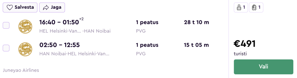 Juneyao Air pakub hetkel väga hea hinnaga lennupileteid Vietnamisse. Edasi-tagasi lennupiletid Helsingist Ho Chi Minh Citysse on saadaval alates 524€ eest ja Hanoisse alates 491€ eest.