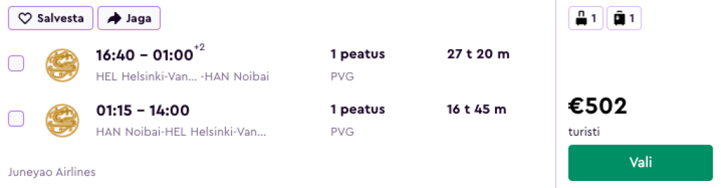 Juneyao Air pakub hetkel väga hea hinnaga lennupileteid Vietnamisse. Edasi-tagasi lennupiletid Helsingist Ho Chi Minh Citysse on saadaval alates 498€ eest ja Hanoisse alates 502€ eest.