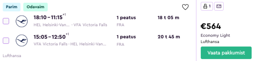 Lufthansa pakub hetkel väga hea hinnaga lennupileteid Zimbabwesse. Edasi-tagasi lennupiletid Helsingist Victoria Fallsi on saadaval alates 564€ eest ning hea hinnaga lennupileteid leiab kevadeks. Eestlased saavad Zimbabwe viisa piirilt. Lennupiletite ostmiseks kliki allpool olevatel näidiskuupäevadel või sisesta need Momondosse