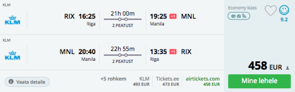 KLM pakub hetkel väga hea hinnaga lennupileteid Riiast Filipiinide pealinna Manilasse. Edasi-tagasi lennupiletid on jaanuaris saadaval vaid 458€ eest. Kuupäevavalikut väga pole ja otsisime välja kõik võimalikud variandid. Parima hinnaga lennupiletid leiad üles läbi Momondo