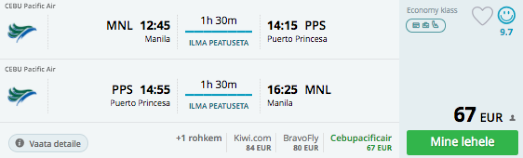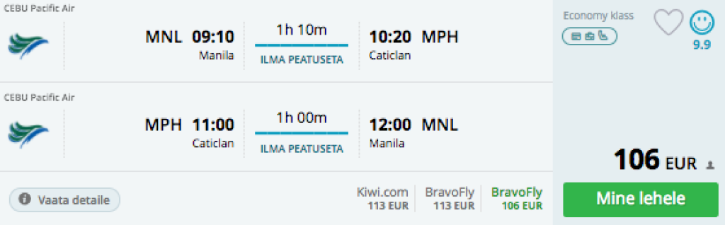 Arvestama peab, et kuna lend Manilasse saabub üsna hilja õhtul, siis tuleb Manilas vähemalt 1 öö veeta. Parima hinnaga hotellipakkumised Manila lennujaama lähedal leiad üles läbi HotelsCombined.ee Otsisime välja variandid lendamaks juba järgmisel päeval (13.01) edasi. Kuna tagasilend algab 23.01 õhtul, siis jõuab ilusti kuskil saarel 10 päeva veeta. Toome välja ka mõned näited, kus saartel veeta 10 päeva: