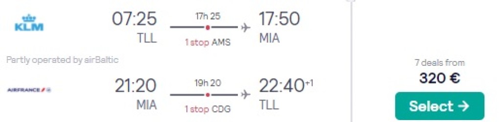 KLM/AF pakuvad hetkel väga hea hinnaga lennupileteid Tallinnast Floridasse. Edasi-tagasi lennupiletite hinnad Miamisse on saadaval alates 320€ eest. Saadavus on suurepärane alates septembrist kuni märtsini välja. Toome allpool vaid näidiskuupäevad, saadavust leiab ka teisteks kuupäevadeks. Parima hinnaga lennupiletid leiad üles läbi Skyscanneri. Kui soovid osta lennupiletid otse lennufirmalt, sisesta alltoodud lennukuupäevad otsingusse KLM'i kodulehel.