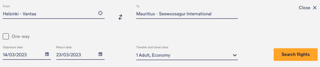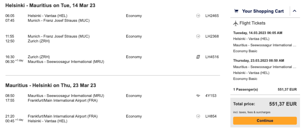 Erinevad Lufthansa Grupi lennufirmad pakuvad hetkel väga hea hinnaga lennupileteid selleks talveks Mauritiusele. Edasi-tagasi lennupiletid Helsingist Mauritiusele on saadaval alates 537€ eest ning hinnas sisalduvad nii äraantav pagas, kui ka toitlustamine lennukite pardal (piletiklassiks Economy Classic). Soodsa hinnaga lennupileteid leiab üksikutel kuupäevadel lähikuudel. Parima hinnaga lennupiletid leiab üles läbi Skyscanneri, aga meie soovitus on osta lennupiletid otse lennufirma kodulehelt Lufthansa.com.