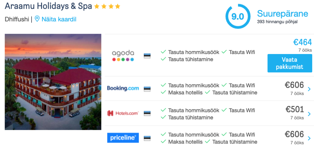 Hotellipakkumised MaldiividelKui otsid soodsa hinnaga öömaja, siis soovitame parima ülevaate ja hinna saamiseks kasutada hotellihindade võrdlusportaali HotelsCombined.ee