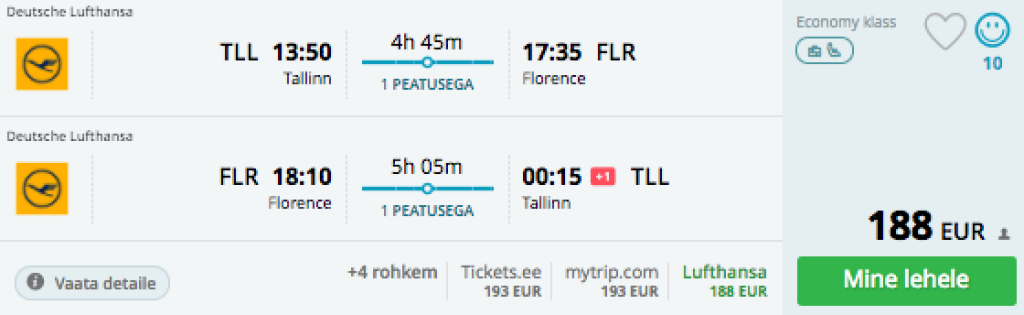 Lufthansa pakub hetkel väga hea hinnaga lennupileteid Tallinnast Toskaanasse. Edasi-tagasi lennupiletid Tallinnast Firenzesse on saadaval vaid 188€ eest ning saadavust jagub kevadest kuni novembrini välja. Lennud on ühe kiire ümberistumisega Frankfurdis. Tõime välja ohtralt näidiskuupäevi. Soodsaimad lennupiletid leiad üles läbi Momondo.ee