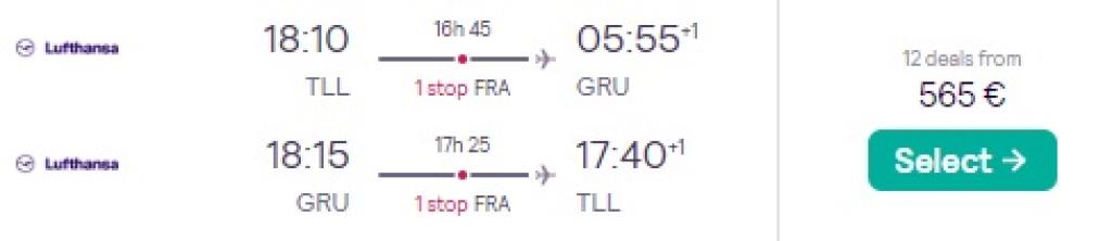 Lufthansa pakub hetkel vägagi atraktiivse hinnaga lennupileteid talveks Brasiiliasse. Ühe ümberistumisega edasi-tagasi Lennupiletid Tallinnast Sao Paulosse on saadaval alates 565€ eest ning hea hinnaga lennupileteid leiab veebruaris ja märtsis. Parima hinnaga lennupiletid leiad üles läbi Skyscanneri, aga meie soovitus on soetada lennupiletid otse lennufirma kodulehelt Lufthansa.com.