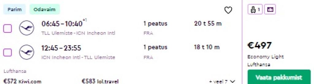 Lufthansa pakub hetkel soodsa hinnaga lennupileteid Lõuna-Koreasse. Edasi-tagasi lennupiletid Tallinnast Seouli on saadaval alates 497€ eest ning saadavust leiab jaanuaris-veebruaris. Lennud on mõlemal suunal ühe ümberistumisega Münchenis või Frankfurdis. Lennupiletite ostmiseks kliki allpool olevatel näidiskuupäevadel või otsi endale sobivad lennupiletid üles läbi Momondo.ee. Kui soovid piletid osta otse lennufirmalt, siis sisesta kuupäevad otse lennufirma kodulehele.