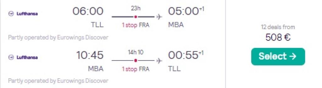Lufthansa pakub hetkel väga hea hinnaga lennupileteid India ookeani äärsesse Keeniasse. Ühe kiire ümberistumisega lennupiletid Tallinnast Mombasasse on saadaval 508€ eest ning hea hinnaga lennupileteid leiab aprillis-maiks. Lennupiletiteni jõudmiseks kliki allolevatel näidiskuupäevadel või mine otse Lufthansa.com ja sisesta lennukuupäevad otsingusse.