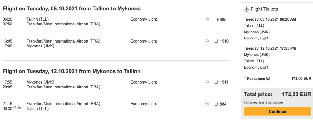 Lufthansa pakub hetkel hea hinnaga lennupileteid Mykonose saarele. Soodsaimad edasi-tagasi lennupiletid Tallinnast on saadaval alates 164€ eest ning hea hinnaga lennupileteid leiab mai lõpust kuni sügiseni välja. Soodsaimad lennupiletid leiab üles läbi Skyscanneri ja kui soovid osta lennupiletid otse lennufirma kodulehelt siis Lufthansa kodulehel on samade lennupiletite hinnaks alates 172€. Vaata pakkumist otse Lufthansa.com