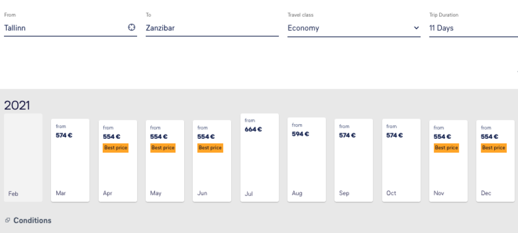 Lufthansa pakub hetkel väga hea hinnaga lennupileteid Tallinnast Sansibarile. Edasi-tagasi lennupiletid on läbi Skyscanneri saadaval alates 528€ eest, aga meie soovitus on osta lennupiletid otse Lufthansa kodulehelt, kus samad piletid on vaid kuskil paarikümne euro võrra kallimad.