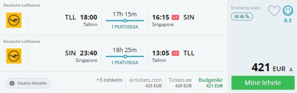 Euroopa parim lennufirma ning hiljuti 5* lennufirmaks saanud Lufthansa pakub hetkel väga hea hinnaga lennupileteid Tallinnast Singapuri. Edasi-tagasi lennupiletid on saadaval vaid 416€ eest ning lendudel on mõlemal suunal üks kiire ümberistumine Frankfurdis. Mainime ka ära, et Frankfurdist Singapuri lendab Lufthansa Airbus A380 lennukiga. Saadavust leiab ohtralt aprillis ja mais.