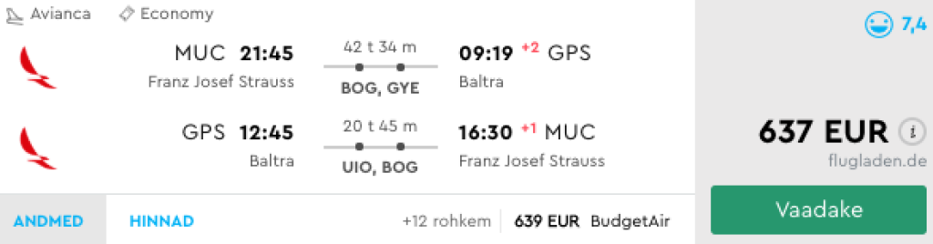 Avianca pakub hetkel väga hea hinnaga lennupileteid algusega Münchenist Galapagose saartele. Soodsaimad edasi-tagasi lennupiletid Münchenist Galapagosele on saadaval alates 637€ eest. Soodsa hinnaga lennupileteid leiab alates novembrist kuni mai lõpuni välja. Lendudel on kaks ümberistumist, Bogotas ning Quitos või Guayaquilis. Kõikidel meie poolt välja otsitud lendudel on olemas ka kiired ümberistumised, mis osadel kuupäevadel võivad mõnikümmend eurot kallimad olla.