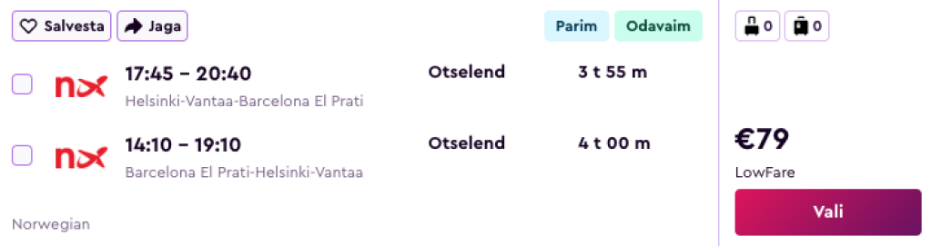 Norwegian pakub hetkel hea hinnaga lennupileteid Vahemere äärsesse Hispaaniasse. Edasi-tagasi lennupiletid otselendudele Helsingist Barcelonasse on saadaval alates 79€ eest.
