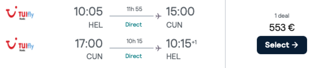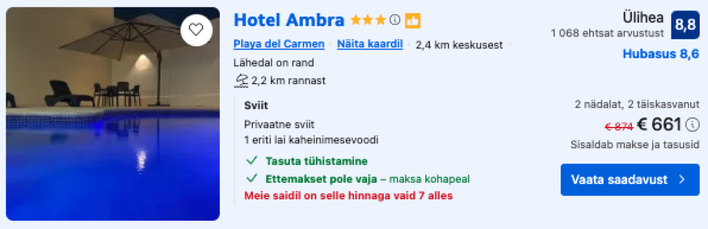 Toome ka välja näite, kuidas saab ise broneerides kahenädalase reisi Mehhikosse kätte vaid 884€ eest (reisides kahekesi). Hinnas sisalduvad TUI lennupiletid algusega Helsingist ning privaatne sviit Playa del Carmenis (14 ööd).