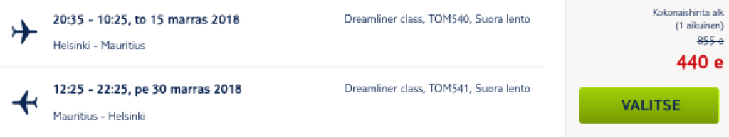 Soome reisikorraldaja TUI pakub hetkel väga hea hinnaga lennupileteid otselendudele Helsingist Mauritiusele. Soodsa hinnaga edasi-tagasi lennupiletid on saadaval novembris-detsembris ning hind on 440€. Soodsate lennupiletite ülesleidmiseks kasuta otselinke allpool või sisesta lennukuupäevad Tui.fi lehele. Varasemate aastate kogemus ütleb, et hinnad võivad viimasel hetkel veelgi soodsamaks minna, aga sel juhul on nii majutus kui autorendi hinnad tunduvalt kallimad. Kõik saadavalolevad lennukuupäevad on veetmaks Mauritiusel kahenädalane puhkus.