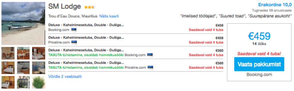 Hotellipakkumised MauritiuselKui otsid soodsa hinnaga öömaja Mauritiusel, siis soovitame parima ülevaate ja hinna saamiseks kasutada hotellihindade võrdlusportaali Hotelscombined.ee Järgnevalt näide soodsast hotellileiust vahemikuks 16.11-30.11.