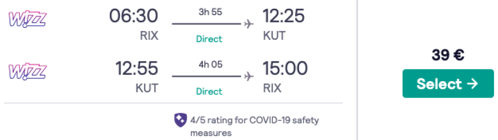 Wizzair pakub hetkel väga hea hinnaga lennupileteid otselendudele Riiast Gruusiasse. Edasi-tagasi lennupiletid Riiast Kutaisisse on saadaval alates 39€ eest ning hea hinnaga lennupileteid leiab ka veetmaks jõulud ja aastavahetus Gruusias.