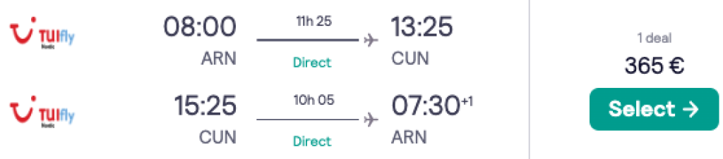 Reisikorraldaja TUI on lennupiletite hindu veelgi langetanud ning pakub hetkel vägagi atraktiivse hinnaga lennupileteid Mehhikosse. Edasi-tagasi lennupiletid otselendudele Stockholmist Cancuni on saadaval alates 365€ eest. Lennupiletite ostmiseks kliki allolevatel näidiskuupäevadel.
