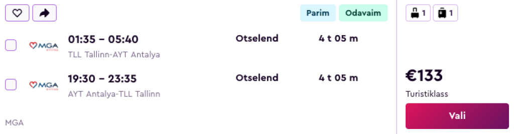 Erinevad lennufirmad pakuvab hetkel suurepärase hinnaga viimase hetke lennupileteid Türgi Rivierasse. Edasi-tagasi lennupiletid otselendudele Tallinnast Antalyasse on saadaval alates 133€ eest.