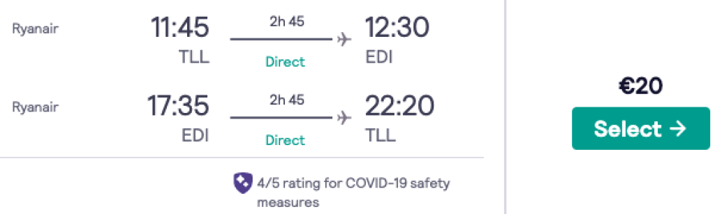Odavlennufirma Ryanair pakub hetkel suurepärase hinnaga lennupileteid Tallinnast Šotimaale. Edasi-tagasi lennupiletid Tallinnast Edinburghi leiab üles alates 20€ eest ning hea hinnaga lennupiletite saadavust leiab juba alates tulevast nädalast. Lennud Tallinna ja Edinburghi vahel toimuvad kuni oktoobri lõpuni 2x nädalas kolmapäeviti ja pühapäeviti ning alates oktoobri lõpust esmaspäeviti ja reedeti. Suurepärase hinnaga lennupiletid leiab ka veetmaks pikk nädalavahetus Edinburghis (K-P või R-E) . Piletiteni jõudmiseks kliki allolevatel näidiskuupäevadel või otsi endale sobivad lennupiletid üles läbi Skyscanneri