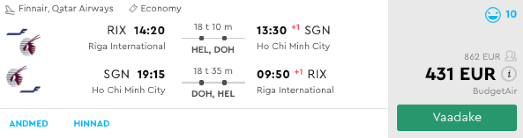 Qatar Airways koostöös Finnairiga pakuvad hetkel väga hea hinnaga lennupileteid sügiseks ja talveks Riiast Vietnami. Soodsaimad edasi-tagasi lennupiletid Riiast Ho Chi Minh Citysse leiab üles vaid 431€ eest. Lendudel on kaks ümberistumist, Helsingis ning Dohas. Lennupiletite hinna sees sisaldub ka äraantav pagas ning toitlustamine Qatar Airwaysi pardal. Parima hinnaga lennupiletid leiad üles läbi Momondo.ee