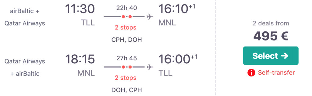Qatar Airways pakub hetkel väga hea hinnaga lennupileteid Tallinnast Filipiinidele. Soodsamad edasi-tagasi lennupiletid Tallinnast Manilasse on saadaval alates 495€ eest. Hea hinnaga lennupiletite saadavust leiab puhkamaks Filipiinidel sügisel. Piletiteni jõudmiseks kliki allolevatel näidiskuupäevadel või kontrolli endale sobivaid kuupäevi läbi Skyscanneri